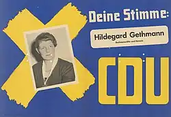 Hildegard Gethmann (geboren am 18. Oktober 1903 in Winz (Hattingen); gestorben 19. Dezember 1988 in Blankenstein (Hattingen)) war eine deutsche Juristin und Frauenrechtlerin.[1] Sie war Mitgründerin und erste Vorsitzende des Deutschen Juristinnenbundes und setzte sich bei verschiedenen Themen dafür ein, dass eine Gleichstellung von Frauen – gemäß Grundgesetz – in den Gesetzen verankert wird.