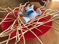 Bei dem Spiel Hilfe! Ein Yeti in den Spaghetti! handelt es sich um ein klassisches Geschicklichkeitsspiel auf der Grundlage des Mikado. Das Spielmaterial besteht neben der Spielanleitung aus 30 verdrehten Stäbchen (Spaghetti), einer Schüssel und einer Yeti-Figur. Es kann mit beliebig vielen Spielern gespielt werden, als Altersempfehlung wird ein Alter ab 5 Jahren angegeben.[1]