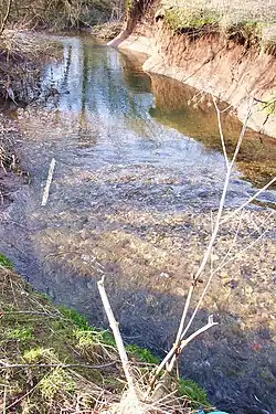 ![]() Hilgenbachmündung, blick stromaufwärts. Der Hilgenbach mündet im Bild von links kommend in die Aa. Es bildet sich am Zusammenfluss ein Kolk. (23. Juli 2011) | ||