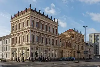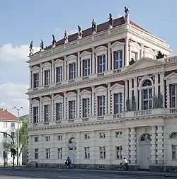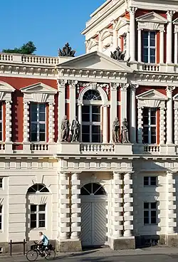 Der plastische Schmuck der Fassaden spiegelt die unterschiedlichen Nutzungen der Gebäudeteile wider. Die Attiken und Balkone der beiden Kopfbauten schmücken 29 Statuen aus Sandstein. Um ihren Oberflächen die Wirkung von Marmor zu verleihen, wurden sie mit Silikatkreide eingerieben. Sie zeigen von der antiken Mythologie und Tracht beeinflusste Männer- und Frauenfiguren, darunter Darstellungen römischer Gottheiten (unter anderem Ceres, Venus und Bacchus) und Musen, Heldenfiguren und Personifikationen der Jahreszeiten. Am früheren Kasernenbau sind in den Keilsteinen der Fensterbögen Maskarons von Kriegern, auf der Attika Wappenkartuschen angebracht.