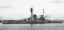 in Scapa Flow. Auffällig sind der markante Dreibeinmast zwischen der unter Wasser liegenden Kapitänsbrücke und dem ersten Schornstein sowie der im Vergleich schlanke Röhrenmast am zweiten Schornstein.