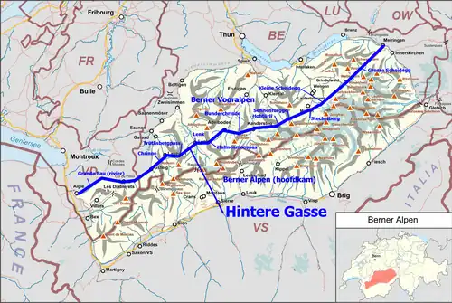 Von Osten herkommend, verläuft die Hintere Gasse von Meiringen über die Grosse Scheidegg nach Grindelwald, dann über die Kleine Scheidegg nach Mürren, über die Sefinenfurgge ins Kiental, über das Hohtürli nach Kandersteg, über die Bunderchrinde nach Adelboden, über den Hahnenmoospass in die Lenk, über die Iffigenalp nach Lauenen, über die Krinne nach Gsteig und über den Col du Pillon nach Les Diablerets, von wo aus die Grande Eau ins Wallis hinabfliesst.