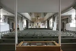 Der Innenraum ist hell gestaltet[2] und besitzt eine das gesamte Kirchenschiff umziehende Rundempore. Die mittig aufgereihten Kirchenbänke sind auf den Kanzelaltar im Altarraum ausgerichtet. Die Orgel steht auf der dem Altar gegenüberliegenden Emporenseite.