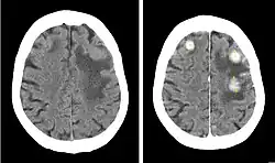 Differentialdiagnostisch zu bedenken sind neben bösartigen hirneigenen Tumoren und Lymphomen auch entzündliche Erkrankungen des Gehirns, deren Klinik und Bildgebung denen von Hirnmetastasen ähneln kann.[13] So werden nicht selten Entzündungsherde bei der Toxoplasmose oder solitäre entzündliche Entmarkungsherde[14] unter dem klinischen Verdacht einer Hirnmetastase operiert. Auch septisch-embolische Hirnabszesse, die bei einer hämatogenen Streuung aus einem Entzündungsherd (zum Beispiel einer infizierten Herzklappe bei Endokarditis) auftreten können, sind manchmal schwer von Metastasen zu unterscheiden. Weiterhin abzugrenzen sind gutartige Hirntumoren wie zum Beispiel Meningeome, die im Verlauf eines Tumor-Stagings zufällig gefunden werden.