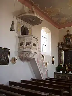 Die katholische Ortskirche ist eine Filialkirche von Altdorf, wird aber seit 1969 vom Pfarrer von Pfahldorf mitversorgt. 2007 zählte man im Dorf 168 Katholiken. Während der von einem Satteldach mit Treppengiebeln abgeschlossene viereckige Kirchturm noch aus der Spätgotik stammt, ist das Langhaus, wie eine Inschrift über dem Portal zeigt, ein Bau der Barockzeit. Es wurde 1743 nach Plänen des fürstbischöflichen Eichstätter Hofbaudirektors Gabriel de Gabrieli durch den Pollenfelder Maurer Joseph Leitner errichtet und am 6. Juni 1746 durch den Eichstätter Weihbischof Johann Gotfried Groß konsekriert. Die Stuckaturen und die polygone Stuckkanzel mit geschweiftem Korpus mit Evangelistenbildern stammen wahrscheinlich von Franz Xaver Horneis, die bis 1955 übertünchten Deckengemälde sind wohl im 19. Jahrhundert entstanden. Der viersäulige Hochaltar mit geschweiftem Aufzug, den eine Engelsglorie schmückt, ist frühes Rokoko aus der Zeit des Neubaus; das Altarbild zeigt den Kirchenpatron als Befreier von Gefangenen, geschaffen von dem Eichstätter Maler Dominikus Murmann. Über den Seitentüren sind spätgotische Plastiken einer Madonna mit Apfel haltendem Jesuskind und eines Heiligen Abtes mit Buch zu finden. Der Kreuzweg wurde um 1766 gemalt. Die beiden zweisäuligen Barock-Seitenaltäre sind in der 2. Hälfte des 18. Jahrhunderts entstanden. Das Altarbild des linken Seitenaltars zeigt Joachim und Anna mit einem jugendlichen Jesus, das des rechten den hl. Stefanus, Steine im Gewand tragend, gemalt von einem gewissen Gerhäuser 1838. Um 1870 kam eine Steinmayer-Orgel in die Kirche. Das Langhausdeckenfresko „Marienkrönung“ kann laut dem Kunsthistoriker Hans Christian Ries dem Münchner Kunstmaler des Neubarock Josef Wittmann zugeschrieben werden. In den 1970er Jahren wurde die Emporenausbuchtung entfernt und 1996 ein neuer Taufstein aufgestellt.