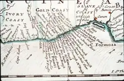 | Sophie-Louise-Schanze (Fort Sophie Louise[1]) | Takrama/Taccarama, hist. Krema | 1684 brandenburgischer Stützpunkt;[2] 1717 an Niederländer verkauft; der genaue Standort ist heute unbekannt, die letzte Forschungsreise zur Wiederentdeckung erfolgte 2016/2017.[3] Wird oft mit der brandenburgischen Lodge Taccarary (heute Takoradi) verwechselt. | |