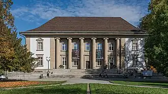 Das Gebäude wurde 1915–1921 nach Plänen der Winterthurer Architekten Bridler & Völki erstellt. Der neoklassizistische Walmdachbau verfügt über eine westliche Schaufassade mit mächtiger Säulenordnung, die auf der Ostseite wiederholt wird. Im zentralen Innenhof finden Veranstaltungen statt, darunter das St. Galler Kulturfestival.