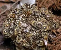 Entdecken Japanische Honigbienen eine Hornissenspäherin, so signalisieren sie mit einem Zittern ihres Hinterleibs, dass ein Gegenangriff eingeleitet werden soll. Mehrere hundert Bienen stürzen sich daraufhin blitzartig auf die Hornisse und lassen ihre Flugmuskulatur vibrieren, um durch Muskelaktivität ihre Körpertemperatur zu erhöhen. Im ballförmigen Schwarm um die Hornisse bildet sich eine Hitzekugel mit einer inneren Temperatur von über 45 °C. Die Hornisse stirbt, während die Bienen bedingt durch einen anderen Stoffwechsel kurzzeitig Temperaturen bis zu 50 °C ertragen können.[1][2] Wahrscheinlich trägt auch die erhöhte CO2-Konzentration in der Hitzekugel zum Tod der Hornissen durch Ersticken bei.[3]