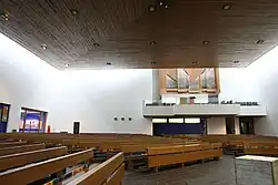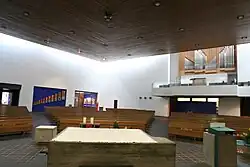 Die Kirche setzt die Vorgaben der Liturgiekonstitution des Zweiten Vatikanischen Konzils um, indem der Altarraum an der südwestlichen Ecke des quadratischen Raums positioniert ist und die Kirchenbänke im Halbkreis auf den Altar ausgerichtet sind. Der Künstler Albert Wider, Widnau, schreibt über die Gestaltung der Kirche: «Wenn bis in die Neuzeit hinein eine Kirche in erster Linie als Haus Gottes bezeichnet worden ist, so erkennt nun das Konzil darin ebenso sehr und ausgeprägt ein Haus der Gemeinde. Die Anordnung der einzelnen Teile muss funktionsgerecht so geformt sein, dass eine Kirche zum Haus des Gottesvolkes werden kann.»[9] Der Volksaltar bildet das Zentrum des Chores und auf den Altar hin sind die Bänke für die Gottesdienstbesucher ausgerichtet. Die Lichtführung der Kirche unterstreicht die zentrale Bedeutung des Altares zusätzlich. Der Tabernakel wurde den Vorgaben des Konzils entsprechend vom Altar getrennt aufgestellt und besitzt die Form einer Stele. Auf den Tabernakeltüren befinden sich Kelch und Hostie, auf der rückseitigen Türe den Lebensbaum. Der Ambo wurde als zweiter wichtiger Ort des Gottesdienstes gestaltet. Er soll „den Dialog zwischen Priester und Volk“ ermöglichen.[10] Zwischen Ambo und Altar befand sich ursprünglich das Vortragekreuz, welches in dieser Anordnung darauf hinwies, dass sowohl Altar als auch Ambo Jesus Christus verkündigen. Das Vortragekreuz zeigt nur das Haupt, das Herz sowie Hände und Füsse von Jesus Christus. Alle anderen Körperteile sind mit dem Kreuz verschmolzen. Dieses Kreuz geht aus den Symbolen der Dreifaltigkeit hervor und verweist auf die Weihe der Kirche an die Trinität. Die Rückseite des Kreuzes zeigt sieben Schalen und verweist auf die sieben Sakramente. Links des Chorraumes befindet sich der Taufbrunnen, der gemäss der Liturgiekonstitution nicht mehr in einer separaten Taufkapelle im hinteren Teil der Kirche, sondern vorne inmitten der Gläubigen platziert wurde. Auf dem Taufbrunnen sind die Sieben Gaben des Hl. Geistes eingeschrieben, welche nach Jesaja 11,2 Weisheit und Verstand, Rat und Stärke, Wissenschaft, Frömmigkeit und Gottesfurcht sind.[11] An der Rückseite des Kirchenraums wurde 1994 auf blauem Grund eine symbolhafte Darstellung des menschlichen Lebens angebracht. Die rechteckigen Tafeln bestehen im unteren Teil aus einem Stein, in den jeweils ein weiterer Stein oder Kristall eingesetzt ist. Der obere Teil der rechteckigen Tafel besteht aus Holz und zeigt einen Baum, in den jeweils Symbole, z. T. als Intarsie gearbeitet, eingelassen sind. Im Jahr 2009 wurde der Innenraum der Kirche renoviert, wobei auch der Tabernakel einen neuen, gekürzten Sockel erhielt. An der Wand des Chorraums befindet sich ein neu geschaffenes Kreuz.