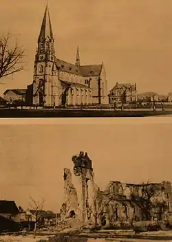 In den letzten Monaten des Krieges war die 1895 geweihte Vorgängerkirche, wie auch der gesamte Ort Fraulautern, Opfer der Granaten- und Bombenangriffe. Dabei wurde am 1. Dezember 1944 das Mittelschiff stark beschädigt. Durch die Zerstörung blieb der Gemeinde zunächst die Apollonia-Kapelle, die jedoch auch so beschädigt wurde, dass Gottesdienste nur in der Notkirche in der Heydingerstraße möglich waren.