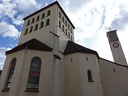 Die aktuelle Kirche ist ein Saalbau mit neoromanischen Elementen (Rundbogenarkaden mit Säulen und Würfelkapitellen an der Eingangshalle und in der zweijochigen Querschiffhalle) des Abstraktions-Historismus. Ebenso vermitteln die Nebenchöre, die sich mit großen Rundbögen zum Chorbereich und zum Kirchenschiff öffnen, eine der Tradition verpflichtete Raumgestaltung. Die Raumdecke des Kirchenschiffes ist eine moderne Rasterbalkendecke deren Querschnitt eine flache Parabel bildet. Der Chorbereich ist mit einem historisierenden Holzlattengewölbe überwölbt. Die Kirche selbst ist etwa 25 Meter hoch. Im Chorbereich erhebt sich ein etwa 30 Meter hoher Turm, der sich in zwei rundbogigen Fensterreihen zu je fünf Fenster an drei seiner vier Seiten öffnet. Die Fensterreihe zum Langhausdach ist nur einreihig ausgebildet. Die Strebepfeiler an den Außenwänden der Kirche sind durch Korbbögen miteinander verbunden. Das hochrechteckige Westfenster schließt ebenfalls in einem Korbbogen.[12]