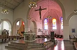 Über dem Altarraum hängt ein mächtiges Kruzifix, dessen Korpus im Jahr 1980 von Luis Piccolruaz in St. Ulrich in Gröden, aus Kastanienholz gearbeitet wurde. Das Kreuz ist dem romanisch-burgundischen Stil des 12. Jahrhunderts nachempfunden. An den Enden der Kreuzbalken befinden sich die Symbole der vier Evangelisten in Holz geschnitzt und farblich gefasst von Bildhauer Matthias Rech, ebenfalls aus St. Ulrich.
