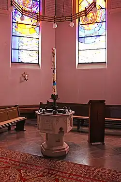 Der Chorraum wurde durch das Vorrücken des Altares zur Taufkapelle umgestaltet. Hier fand das neogotisch Taufbecken aus dem Vorgängerbau nach Überarbeitung des Sockels durch den Fraulauterner Steinmetzen Anton Knauf seinen Platz. Die Bekrönung des Taufbrunnens, die die Osterkerze trägt, wurde ebenso wie die Altarumkleidung von Johann Baptist Lenz entworfen und ausgeführt.