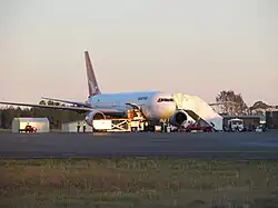 Das ehemalige internationale Terminal nördlich vom Inlandsterminal ist einer von zwei Abfertigungsflügeln im zusammengelegten Terminal. Der Bau wurde 1983 fertiggestellt und 1985 aufgewertet, um Flugzeuge bis zur Größe einer Boeing 767 aufnehmen zu können.[47] Der internationale Flugverkehr in Hobart blieb jedoch im Linienflugbetrieb mit einer inzwischen wieder eingestellten Flugverbindung der Air New Zealand nach Christchurch sehr bescheiden. Auch die vier bis fünf Charterflüge der Singapore Airlines von November bis Dezember mit Airbus A330 oder Boeing 777 bedeuten kein großes internationales Flugaufkommen.[32] Deshalb wird der Trakt des ehemaligen internationalen Terminals von den Fluggesellschaften Virgin Australia und Skytraders genutzt; als Tiger Airways Australia noch nach Hobart kam, nutzte sie ebenfalls den Pier.[16]