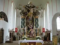 Bei der Innenausstattung der Kirche ist das Gemälde des Hochaltars hervorhebenswert, das die Himmelfahrt und Krönung Mariens darstellt, eine Arbeit des Rubensschülers Caspar de Crayer. Im unteren Teil ist Martin dargestellt, der Kirchenpatron. Weitere dort zu findende Heilige sind der Apostel Johannes mit Kelch, Margaretha mit Kreuz, Johannes der Täufer und Barbara mit Palme. Im unteren Teil stehen vier weiß angestrichene Holzfiguren weiterer Heiliger, wobei die beiden inneren Franz Xaver und Ignatius, die beiden äußeren Augustinus und Nikolaus darstellen. Seitlich des Hochaltars stehen zeitlich spätere Figuren von Josef und Maria, sie wurden 1828 hinzugefügt. Und oben am Gewölbeansatz sind seitlich des Hochaltares zwei Figuren der Erzengel angebracht, Michael links und Gabriel rechts. Davor steht oberhalb der letzten zwei Stufen zum Chorraum der Kreuzaltar aus dem Jahr 1760 mit der schmerzhaften Muttergottes, eine Arbeit von Bildhauer Johann Georg Reusch aus Waldsee. Nahe dem Turmeingang steht der Nikolausaltar, der aber 1867 seines barocken Aufbaus verlustig ging und auch nicht mehr das ursprüngliche Gemälde hat. Das ist heute über dem Eingang zum Turm angebracht, während der Altar jetzt ein Gemälde mit der Darstellung der letzten Kommunion des Hieronymus trägt, das 1856 erworben wurde. Zwei große Seitenaltäre stehen im Querschiff, links der Josefsaltar, rechts der Marienaltar. Beide sind Arbeiten von Eustachius Gabriel aus Unterschwarzach und entstanden 1767. Der Josefsaltar trägt ein Bild des Josef, wie der Maria das Jesuskind reicht, Joachim und Anna schauen unten zu. Oben ist noch ein Bild mit dem Empfang der Wundmale durch Franz von Assisi. Eine Martinsfigur (Kirchenpatron) ist über dem Drehtabernakel aufgestellt. Der Marienaltar hat als Hauptgemälde Maria als Rosenkranzkönigin mit Dominikus und Katharina von Siena, oben zusätzlich ein Bild der Guten Beth von Reute, auch sie empfängt gerade die Wundmale. Hier ist eine Madonna mit Kind über dem Drehtabernakel aufgestellt. Die barocke Kanzel ist linkerhand im Hauptschiff angebracht, sie trägt auf dem Korb ein Relief mit der Predigt von Johannes dem Täufer. Die Deckengemälde, die Szenen aus dem Leben des Kirchenpatrons Martin zeigen, entstanden 1846; der Künstler ist Fidelis Schabet aus Wurzach.[11][12]