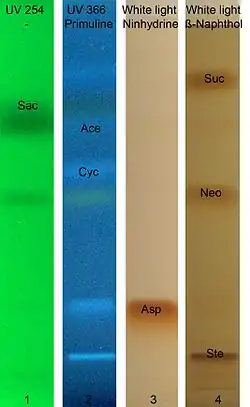 - ↑ G. Morlock, M. Vega: Two new derivatization reagents for planar chromatographic quantification of sucralose in dietetic products. In: J Planar Chromatogr. Band 20, 2007, S. 411. doi:10.1556/JPC.20.2007.6.4