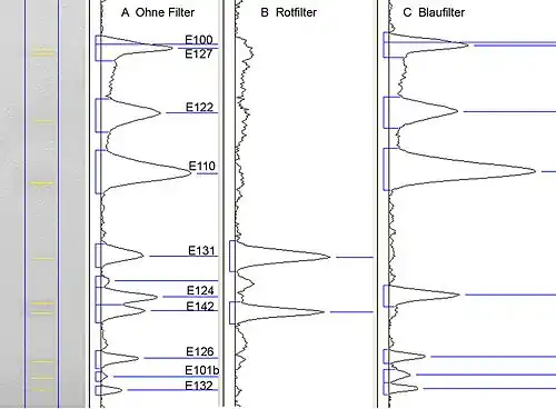 Die Auswertung mittels elektronischer Bilderfassung ist eine jüngere, sehr schnelle Variante der Erfassung des gesamten Trennbildes. Sie erfolgt im polychromatischen sichtbaren (weißen) Licht. Wird zur Beleuchtung langwelliges UV-Licht (z. B. UV 366 nm) verwendet, erfasst die Kamera die Fluoreszenz der Zonen im sichtbaren Bereich, wird kurzwelliges UV-Licht (z. B. UV 254 nm) für Schichten mit Fluoreszenzindikator verwendet, erfasst die Kamera – genau wie das menschliche Auge – die Fluoreszenzminderung des Fluoreszenzindikators durch Trennzonen, die in einer großen Bandweite um UV 254 nm absorbieren. Aus den Bilddaten ist eine Quantifizierung möglich. Dazu wird ein Bahnraster über das Bild gelegt und das Bild in Grauwerte umgerechnet. Über jede Zeile einer Bahn werden die Grauwerte summiert. Dadurch ergibt sich die Analogkurve. Die spektrale Selektivität ist auf die visuelle Farberkennung beschränkt, ermöglicht aber den Einsatz von selektiven Filtern (Abb. 4).