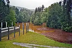Innerhalb des Bereiches des Rückhaltebeckens war ein neuer Bachlauf entstanden. Das Wasser suchte sich einen neuen Weg durch den Wald und riss viele Bäume mit.[11]