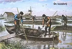 Mit dem Aufkommen des sogenannten baggerbeugel, einer Art Kescher mit langem Stiel, im 16. Jahrhundert konnte der Torf auch unterhalb der Wasseroberfläche abgebaut werden, eine Praxis die als slagturven bekannt war. Anschließend wurde der gestochene Torf auf ausgesparten Flächen, den sogenannten legakkers getrocknet. Eine Folge des slagturvens, vor allem wenn es im großen Maßstab angewendet wurde, war die Bildung teils großflächiger Seen durch die Überflutung der legakkers bei Stürmen.[5] So konnten sich gelegentlich mehrere kleine Seen nach einem starken Sturm zu einem einzigen großen Gewässer vereinigen. Auf diese Weise vereinigten sich im 16. Jahrhundert Haarlemmermeer und Leidsemeer, wodurch eine Wasserfläche erheblicher Größe entstand. Erst im 19. Jahrhundert beschloss man, diese trockenzulegen.[6] Weitere Beispiele für auf diese Art entstandene Gewässer sind die Loosdrechtschen Plassen sowie die Vinkeveense Plassen im Nordwesten von Utrecht.[7]
