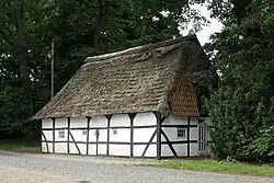 - dem eingeschossigen giebelständige Dreimädelhaus von 1767 als Zweiständerhallenhaus in Fachwerk mit Steinausfachungen, einem reetgedeckten Krüppelwalmdach und Niedersachsengiebel mit Uhlenloch sowie der Grooten Door mit geradem Abschluss,