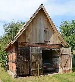 - der Scheune von 1825 mit seitlicher Längseinfahrt mit Ausfachungen aus Klinkern, an das Wohnwirtschaftsgebäude angebaut, mit Steinausfachungen, Krüppelwalmdach und Niedersachsengiebel mit Uhlenloch und Pferdeköpfen am First,