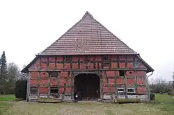 - dem eingeschossigen zurückversetztem Backhaus in Ziegelfachwerk und Satteldach
