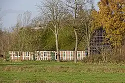 - der giebelständigen Scheune (Kornscheune) von um 1890 in Fachwerk mit Steinausfachungen, mit reetgedecktem Satteldach und mit außermittiger Längseinfahrt sowie einer Ladeluke; das Tor zur Einfahrt erhielt eine gläserne Fassade.[3]