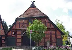 - dem eingeschossigen Wohn- und Wirtschaftsgebäude von 1621 (Inschrift) als niederdeutsches Zweiständer-Hallenhaus (12,15 × 21,50 m groß) in Fachwerk mit Steinausfachungen und einem ziegelgedeckten Krüppelwalmdach als Niedersachsengiebel mit Uhlenloch und Pferdeköpfen sowie mit beidseitig reich verziertem Renaissancegiebel mit der (später rundbogigen) Grooten Door und Balkeninschrift für die Erbauer „Heinrich Wilkens – Allheit Wilkens“, eingefasst mit den Wappen mit Zange und Hammer, mit vorstehenden Stichbalken, gestützt durch geschweifte Knaggen, und mit rankenverzierten Füllhölzern zwischen den Stichbalken und der Giebelschwelle sowie an der unteren Kante ein Zahnschnittfries sowie mit einem einfacheren rückseitigen Wohngiebel,