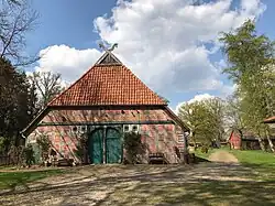 - dem eingeschossigen traufständigen Wohn- und Wirtschaftsgebäude von 1808 (Inschrift) als Zweiständer-Hallenhaus in Fachwerk mit Steinausfachungen, ziegelgedecktem Krüppelwalmdach, Niedersachsengiebel mit Uhlenloch, Pferdeköpfen und Grooter Door mit Korbbogen,[2]