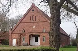 - dem eingeschossigen langgezogenen massiven Wohn- und Wirtschaftsgebäude von 1876 (Inschrift) als Hallenhaus mit Satteldach, zentraler Toreinfahrt, Fassaden mit Backsteindekor mit Zierfriesen, Nischen mit Kaffgesimsen u. a. im Giebeldreieck und seitlichen Fialturmansätzen,