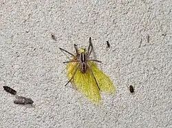 - ↑ a b c d e Charles D. Dondale, James H. Redner: The insects and arachnids of Canada, Part 17. The wolf spiders, nurseryweb spiders, and lynx spiders of Canada and Alaska, Araneae: Lycosidae, Pisauridae, and Oxyopidae. In: Agriculture and Agri-Food Canada (Hrsg.): Research Branch Agriculture Canada Publication. Band 1856, Nr. 1, 1990, ISBN 0-660-13628-7, S. 46.