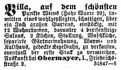 - ↑ Villa, auf dem schönsten Punkte Wiens (Hohe Warte 29). In: Neue Freie Presse, 19. Mai 1895, S. 32 (online bei ANNO).