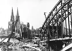 Im Zweiten Weltkrieg war die Hohenzollernbrücke eine der wichtigsten und am stärksten befahrenen Eisenbahnbrücken in Deutschland. Obwohl sie dadurch als strategisch wichtiger Rheinübergang zu einem vorrangigen Ziel für Luftangriffe der Alliierten insbesondere bei der Operation Millennium wurde, war sie bis zum Ende des Krieges zwar leicht beschädigt, aber befahrbar und somit eine der letzten intakten Rheinüberquerungen. Während des Vorrückens der amerikanischen Truppen in die Innenstadt am 6. März 1945 wurden die Brückenpfeiler durch Pioniere der sich zurückziehenden deutschen Wehrmacht gesprengt. Dabei wurden die uferseitigen Bögen teilweise nur gering beschädigt, so dass eine spätere Wiederverwendung möglich war.[8]