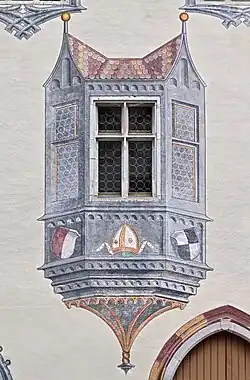 Die Hoffassaden der Schlossflügel und der Torturm wurden um 1499 mit ungewöhnlich reichen Architektur- und Illusionsmalereien geschmückt. Die Fenster werden von prächtigen Wimpergen mit Krabben- und Kreuzblumenschmuck eingerahmt. Aus den Fassaden springen scheinbar zahlreiche – größere und kleinere – wappenverzierte Erker vor. Als ausführender Meister wird der Hechinger Maler Fidelis Eichele vermutet. Der heutige Bestand ist allerdings stark restauriert.[1]