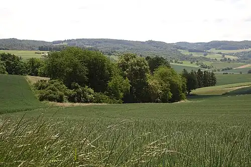 Mordkaute von Osten, dahinter der Weiler Hundertmorgen (2020)