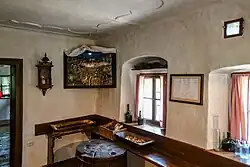 Die große Stube im Inneren war einstmals die Werkstätte der Maultrommelmacher. Die Stuckdecke ist mit „S.H. 1803“ bezeichnet und deutet auf den damaligen Eigentümer Sebastian Hofer hin. Zwei Werkstöcke stehen noch an ihrem ursprünglichen Platz.