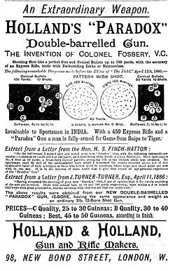 Ab 1886 hatte Holland & Holland die Markenrechte für die Paradox Gun. Es war eine patentgeschützte, doppelläufige Paradoxflinte, mit der Schrot- und Flintenmunition verschossen werden konnte. Die Paradox Gun wurde in verschiedenen, heute ungebräuchlichen, Kalibern hergestellt, von der wuchtigen 2 Bore bis zu 48 Bore. 1904 ließ Holland & Holland die selbst entwickelte Gürtelpatrone patentieren. Von ihr wurden zahlreiche andere Patronen abgeleitet. Unter ihnen war die 1912 eingeführte .375 H&H Magnum die meistproduzierte.[3]