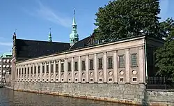 Die Fassade zum Slotsholmen ist durch Lisenen in 21 Joche unterteilt, die dem Kryptensystem entsprechen (2 Joche für jede Endkrypta). Jedes Joch hat ein großes Fenster zur Halle und ein kleineres Fenster zur Krypta. Dazwischen befindet sich eine ovale Öffnung mit aufgemalten Gittern, die nie als Fenster dienten. Sie wurden wahrscheinlich nur angebracht, um die Fassade an die Einfriedungsmauer anzupassen, die den Friedhof auf der Nordseite von der Straße (heute Holmens Kanal) abgrenzte.