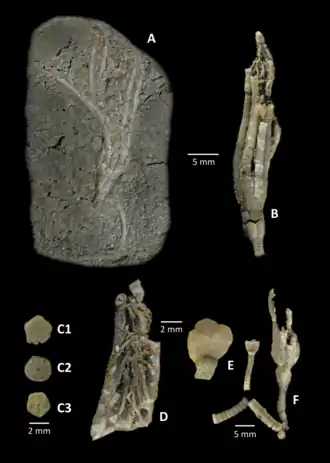 Holocrinus wagneri (BENECKE, 1887), Unterer Muschelkalk, Elfershausen, Museum Terra Triassica Euerdorf: A: Krone, SMTE 5825-1-5; B: Krone, SMTE 5825-1-38; C1–C3: Columnale, C1, SMTE 5825-1-32A; C2, SMTE 5825-1-47B; C3, SMTE 5825-1-41; D: Arme mit Pinnulae, 5825-1-33; E: Basalia und Infrabasalia mit Stiel, SMTE 5825-1-32; F: Krone mit Stiel, SMTE 5825-1-47A. | ||||||||||||
