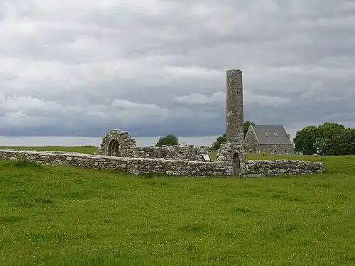 Auf Holy Island liegen ihre Ruinen und ein Rundturm, dessen Eingang etwa 3,0 m über dem Boden liegt. Er ist nach St. Cosgrath, einem Einsiedler benannt, der im 10. Jahrhundert hier wohnte. Die 25 Morgen große Insel ist noch Begräbnisstätte und wird von Pilgern aufgesucht. Der Rundturm wurde von Liam de Paor ausgegraben, seine Restaurierung dauerte von 1970 bis 1980. Trotzdem wurden keine Steine gefunden, die zur Kegelmütze des Turms gehören könnten. Die Legende besagt er sei unfertig geblieben, weil der Maurer von einer schönen blonden Hexe abgelenkt wurde.