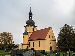 Die evangelisch-lutherische Pfarrkirche Heilig-Kreuz steht außerhalb des Dorfkerns. Es ist eine Chorturmkirche, die auf ein Gotteshaus aus dem Anfang des 13. Jahrhunderts zurückgeht. Ab 1528 hatte die Gemeinde einen evangelischen Pfarrer. Das Langhaus, um 1600 nachgotisch gestaltet, ist ein Saalbau mit einem Satteldach. Es hat seitlich angebaut einen Treppenturm für die Emporen und eine Sakristei. Der Kirchturm besitzt als oberen Abschluss eine Zwiebelhaube mit einer Laterne.