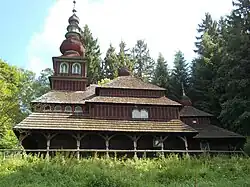 Das Gebäude ist eine typische ukrainische dreiteilige Kirche aus Eichenholzbalken mit einer Länge von etwa 14 Metern und einer Breite von etwa acht Metern. Das Dach ist mit Schindeln gedeckt. Über dem westlichen Vorraum (babinec) befindet sich der 16 Meter hohe barocke Kirchturm mit einer verglasten Luzerne. Im Inneren befindet sich unter anderem der historische Taufstein.