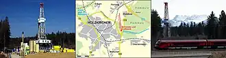 Im Osten des Marktes (an der B 318) wurde durch die kommunalen Gemeindewerke Holzkirchen ein Geothermiekraftwerk errichtet. Am 30. April 2015 hat sich der Gemeinderat mit einer Mehrheit von 17 zu 8 Stimmen für die Realisierung des seit dem Jahr 2006 entwickelten Projekts entschieden.[21] Nach der Rodung des Bauplatzes wurden an den Ausgangspunkten für die beiden Tiefbohrungen der geothermischen Dublette zunächst zwei Führungsrohre (je 50 m lang, 66 cm Durchmesser, 10 Tonnen schwer) im Abstand von 7,5 Metern einbetoniert.[22] Am Barbaratag (4. Dezember 2015) wurde der Bohrplatz mit einem ökumenischen Gottesdienst eingeweiht. Am 14. Januar 2016 wurde der 57 Meter hohe Bohrturm aufgerichtet. Bohrbeginn mit Meißelweihe fand am 28. Januar 2016 in Anwesenheit der Staatsministerin Ilse Aigner statt. Die Tiefbohrarbeiten erfolgten rund um die Uhr. Jede Bohrung wurde in fünf Sektionen niedergebracht, die sich mit zunehmender Tiefe von 58,4 cm (Oberfläche) auf 15,5 cm (ab ca. 4800 m Tiefe) verjüngen. Der Bohrmeißel wurde durch ein Richtbohrsystem in der ersten Bohrung nach Nordosten bzw. in der zweiten Bohrung nach Westen abgelenkt. Durch geologisch-technische Probleme (Anbohren einer Gasblase / verklemmte Verrohrung und feststeckendes Bohrgestänge) kam es zu einer Verzögerung der Bohrarbeiten um mehrere Monate. Anfang April 2017 waren die Bohr- und Testarbeiten beider Tiefbohrungen abgeschlossen und der Bohrturm wurde demontiert. Die zweite Bohrung ist mit einer Bohrstrecke von 6084 m bis in ca. 5100 m Tiefe die tiefste und längste Geothermiebohrung Deutschlands, die zudem mit deutlich über 150 °C das heißeste Thermalwasser im Voralpenland liefert. Zunächst wurde im Dezember 2018 die neu errichtete Heizzentrale und das Fernwärmenetz an die Geothermie angeschlossen.[23] Die Inbetriebnahme des Kraftwerks zur Stromerzeugung erfolgte dann im Juli 2019,[24] die offizielle Einweihung der gesamten Geothermieanlage schließlich am 16. November 2019.[25] Ca. 3,5 MW elektrische Leistung werden in dem Kraftwerk geothermisch generiert.