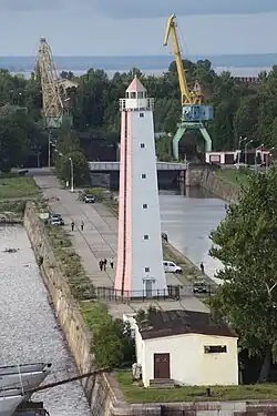 Der weiße Leuchtturm befindet sich am Pier neben dem Petrowskikanal (russisch Петровский канал[5]), der den Handelshafen (russisch Купеческая гавань Kupetscheskaja gawan) vom Mittelhafen Kronstadts trennt.