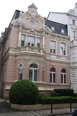 Die neobarocke Halbvilla hat straßenseitig drei Achsen. Das Gebäude ist zweigeschossig mit Giebelgeschoss. Es hat eine aufwändige Stuckfassade mit Erker und Blendgiebel mit Voluten sowie ein schiefergedecktes Mansarddach.