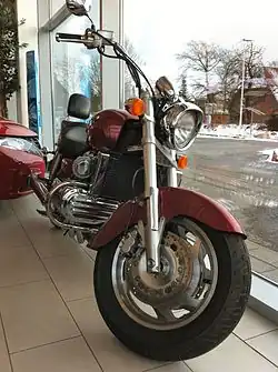 Die weit herunter gezogenen Schutzbleche, der große Tank und die breite sattelförmige Sitzbank mit separatem Soziusteil bilden weitere Akzente, dazu kommen für eine Chopper typisch viele Chromteile.