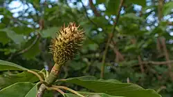 Die wechselständigen, meist an den Enden der Zweige gehäuft angeordneten Laubblätter sind in Blattstiel und -spreite gegliedert. Der kurze Blattstiel ist 2 bis 3 Zentimeter lang. Die einfache, ganzrandige Blattspreite ist bei einer Länge von 20 bis 40 Zentimetern sowie einer Breite von 13 bis 25 Zentimetern verkehrt-eiförmig, mit gerundeter bis spitzer Spreitenbasis, und die Spitze ist gerundet, stumpf bis bespitzt. Die etwas bläulich, glauk gefärbte Blattunterseite ist flaumig behaart. Die Blattoberseite ist kahl.[2] Nebenblätter sind vorhanden und fallen bald nach dem Entfalten des zugehörigen Laubblattes ab.