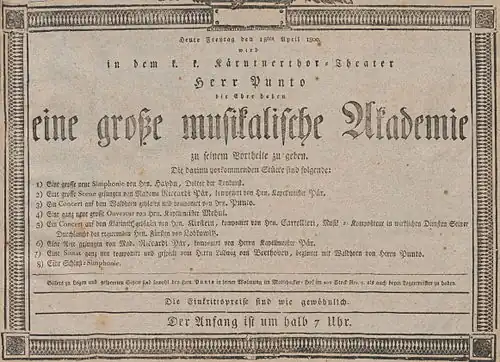 „Der berühmte, und jezt wahrscheinlich größeste Waldhornist in der Welt, Herr Punto, (ein Böhme von Geburt, sein eigentlicher Name ist: Stich,) hält sich jezt in Wien auf. Er gab vor kurzem eine musikal. Akademie, in welcher sich vor allem eine Sonate für Fortepiano und Waldhorn, komponirt von Beethoven, und gespielt von diesem und Punto, so auszeichnete und so gefiel, daß, trotz der neuen Theaterordnung, welche das Da Capo und laute Applaudiren im Hoftheater untersagt, die Virtuosen dennoch durch sehr lauten Beyfall bewogen wurden, sie, als sie am Ende war, wieder von vorn anzufangen und nochmals durchzuspielen.“[2]