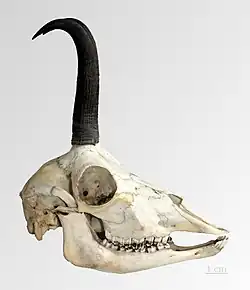 Weitere charakteristische Merkmale bestehen im Gebiss- und Skelettbau. Generell ist der Schädel der Hornträger sehr einheitlich gebaut, unabhängig des Verwandtschaftsverhältnisses oder der bewohnten Landschaftsräume. Variationen finden sich lediglich in Einzelmerkmalen wie der Zahnkronenhöhe, der Schnauzenlänge oder in der allgemeinen Größenausprägung, die in gewissem Maße die Ernährungsweise widerspiegeln.[8] Als auffallendes Charakteristikum fehlen im Gebiss die oberen Schneidezähne, der obere Eckzahn sowie der erste Prämolar im Ober- und Unterkiefer. Nur einige frühe, heute ausgestorbene Formen besaßen noch einen kleinen oberen Eckzahn, vergrößerte Eckzähne, wie sie bei einigen Hirschen und bei den Moschustieren auftreten, waren bei Hornträgern nie ausgebildet. Der untere Eckzahn ähnelt den Schneidezähnen (incisiform). Die standardisierte Zahnformel der Hornträger lautet: Bei manchen Arten fehlt aber teilweise auch der zweite Prämolar. Generell sind die Prämolaren molarisiert, ähneln also den hinteren Backenzähnen. Diese werden durch ein Kauflächenmuster aus längsverlaufenden, mondsichelartigen (selenodonten) Zahnschmelzleisten gekennzeichnet. Sie sind zudem deutlich hochkroniger (hypsodont) als bei den Hirschen. Die Zahnreihe endet in der Regel unter der Orbita. Die Stirnhöhlen sind bei einem größeren Teil der Hornträger stark zurückgebildet.[9][2][6]
