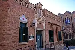erbaut 1902–1911 Hauptgebäude und Visitenkarte des Hospitals In drei Teile gegliederter Baukörper, der Zentralbau mit einer imposanten, neugotischen Turmstruktur mit Uhr und bedeutendem Bildschmuck; Seitenflügel eher konventionell, jedoch mit vielen modernistischen Schmuckelementen. |